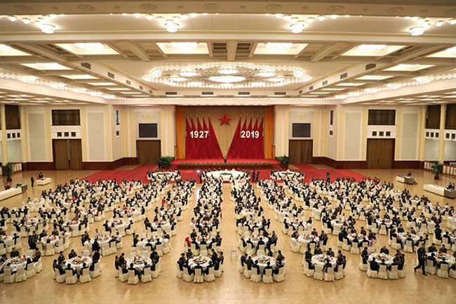 人民大會(huì)堂燈火輝煌,中外嘉賓歡聚一堂。主席臺(tái)帷幕中央懸掛著巨型“八一”軍徽,兩旁是十面鮮艷的紅旗?!?927-2019”醒目的大字熠熠生輝,昭示著中國人民解放軍走過92年不平凡歲月。